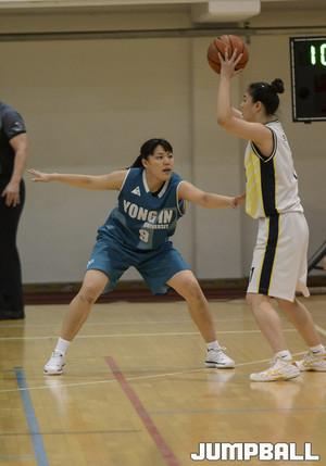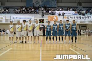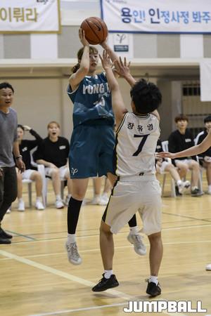 [점프볼/용인=홍기웅 기자] 15일 용인대학교 실내체육관에서 열린 '2017 남녀 대학 농구리그' 용인대와 수원대의 여자부 플레이오프 4강전. 수원대 장유영이 파울을 당해 중심 잃고 넘어지고 있다.