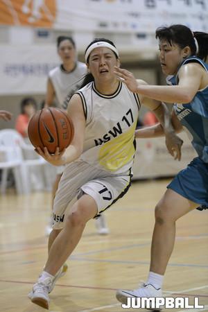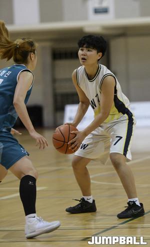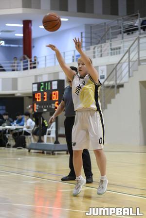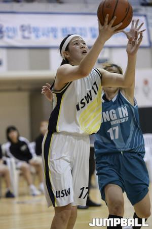 [점프볼/용인=홍기웅 기자] 15일 용인대학교 실내체육관에서 열린 '2017 남녀 대학 농구리그' 용인대와 수원대의 여자부 플레이오프 4강전. 수원대 장유영이 레이업을 올리는 도중 파울을 당하고 있다.