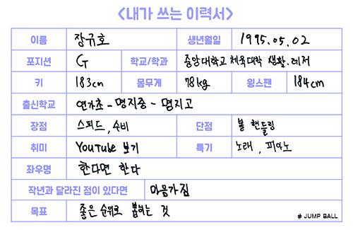 [점프볼=강현지 기자] 2017년 신인 드래프트에 도전하는 ‘예비 프로’가 쓰는 취업 이력서. 열다섯 번째의 주인공은 중앙대학교 주장, 장규호(22, 183cm)이다. 올 시즌 장규호의 목표는 ‘멀티플레이어’. 후반기 자신감을 되찾은 그가 개인 목표를 달성함과 동시에 대학 생활 유종의 미를 거둘 수 있을까. 그의 # 성장과정과 # 입사(프로 데뷔) 후 포부를 들어보자.