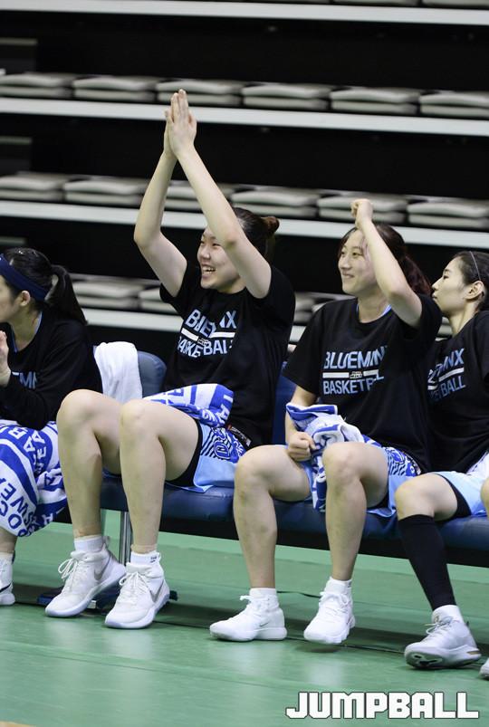 [점프볼/아산=홍기웅 기자] 17일 아산이순신체육관에서 열린 '한일 여자농구 클럽 챔피언십' 둘째 날 삼성생명과 우리은행의 경기. 삼성 벤치에 있는 선수들이 동료가 선전하자 기뻐하고 있다.