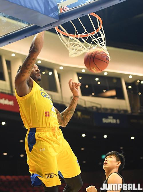 20일 마카오 스튜디오 시티 이벤트홀에서 열린 동아시아 최고의 클럽팀을 가리는 'THE SUPER 8' 농구대회에 서울 삼성 썬더스와 푸본 브레이브스의 경기, 삼성 커밍스가 호쾌한 원핸드 덩크를 작렬하고 있다.