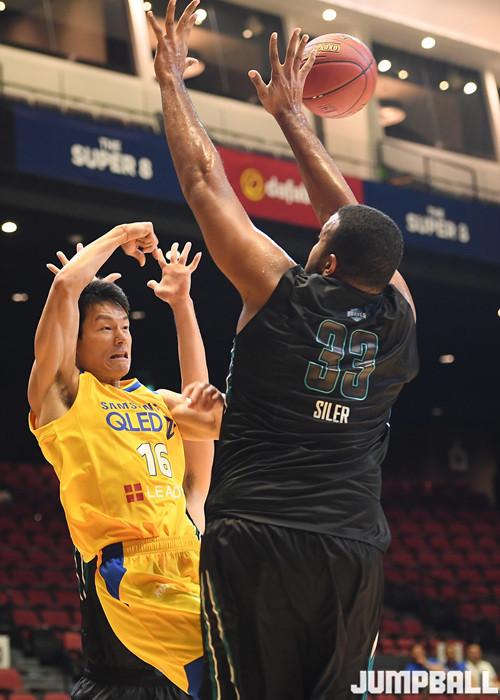 20일 마카오 스튜디오 시티 이벤트홀에서 열린 동아시아 최고의 클럽팀을 가리는 'THE SUPER 8' 농구대회에 서울 삼성 썬더스와 푸본 브레이브스의 경기, 삼성 김태형이 골밑에서 수비에 막히자 외곽으로 패스하고 있다.