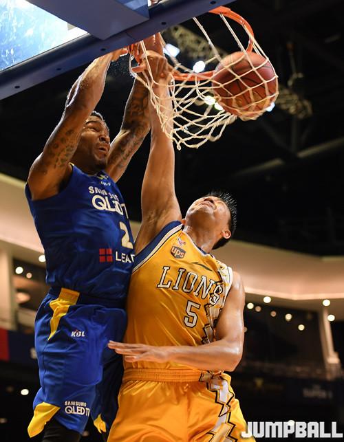 21일 마카오 스튜디오 시티 이벤트홀에서 열린 동아시아 최고의 클럽팀을 가리는 THE SUPER 8' 농구대회에 서울 삼성 썬더스와 저장 광샤 라이온스의 경기, 삼성 커밍스사 상대수비를 앞에두고 파워 덩크를 작렬하고 있다.