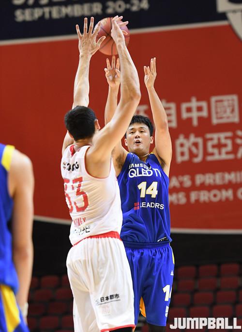 22일 마카오 스튜디오 시티 이벤트홀에서 열린 동아시아 최고의 클럽팀을 가리는 'THE SUPER 8' 농구대회에서 치바 쳇츠와 서울 삼성 썬더스의 경기, 삼성 김동욱이 외곽에서 3점슛을 거침없이 던지고 있다.