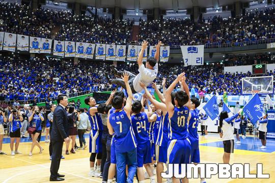 [점프볼=서울/홍기웅 기자] 22일 잠실실내체육관에서 열린 '2017정기 고연전' 농구경기. 연세대 선수들이 승리해 은희석 감독을 포함해 학교 관계자를 헹가래하자 연세대 학생들이 흰 불빛을 비춰 화답하고 있다.