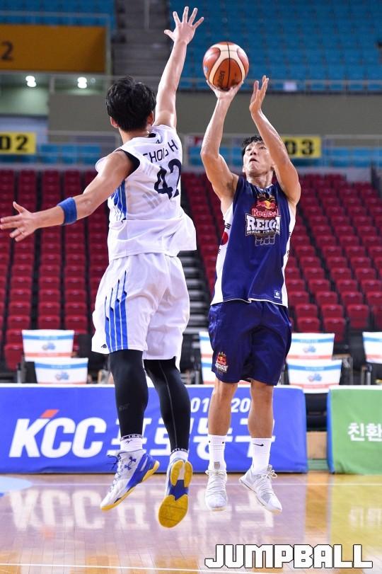 아울스 김상훈이 케페우스의 수비를 피해 3점슛을 시도하고 있다.