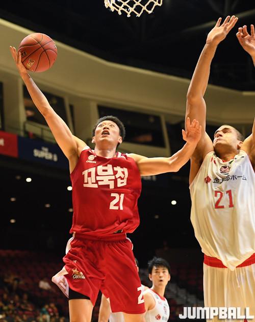 23일 마카오 스튜디오 시티 이벤트홀에서 열린 동아시아 최고의 클럽팀을 가리는 'THE SUPER 8' 농구대회 4강전으로 치바 젯츠와 고양 오리온의 경기, 오리온 김강선이 골밑을 저돌적으로 파고들어 상대수비를 강하게 뿌리치고 득점을 하고 있다.