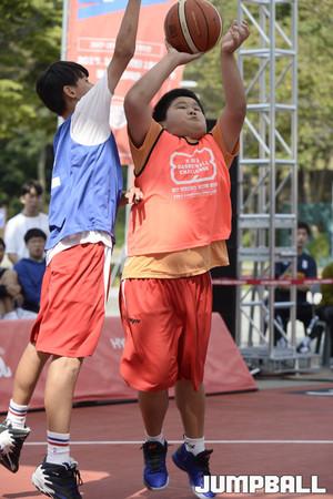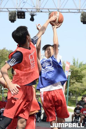 [점프볼=울산/홍기웅 기자] 24일 울산대공원 청소년광장에서 열린 2017 울산 현대모비스 3on3 바스켓볼 챌린지 8강 중등부 4경기 슈프림과 모비스 야음 경기. 슈프림 선수가 리버스 레이업을 시도하고 있다.