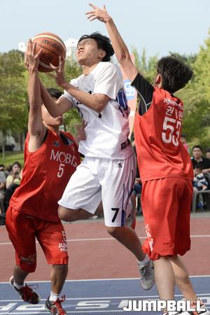 [점프볼=울산/홍기웅 기자] 24일 울산대공원 청소년광장에서 열린 2017 울산 현대모비스 3on3 바스켓볼 챌린지 일반부 4강 ULBA와 인터하이 경기. ULBA 선수가 동료의 스크린을 받고 점프 슛을 던지고 있다.