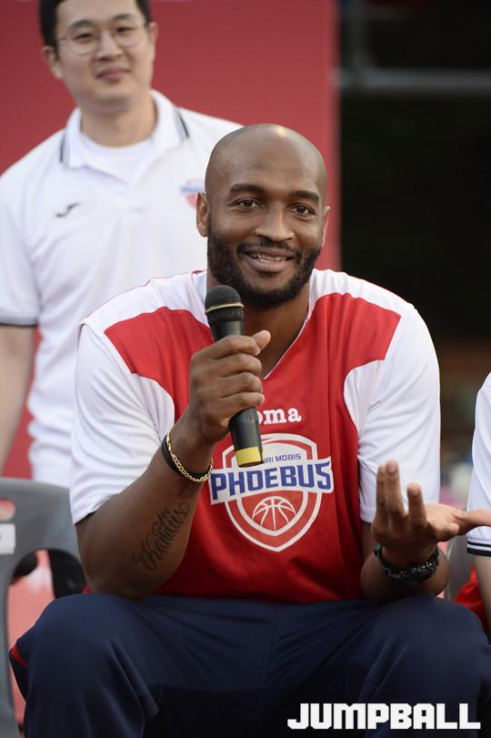 [점프볼=울산/홍기웅 기자] 24일 울산대공원 청소년광장에서 열린 2017 울산 현대모비스 3on3 바스켓볼 챌린지. 선수들에게 질문하는 시간에 레이션 테리에게 3점슛을 시즌에 몇개 넣을껀지 물어보자 '100개이상 넣도록 노력할 것'이라고 대답하고 있다.
