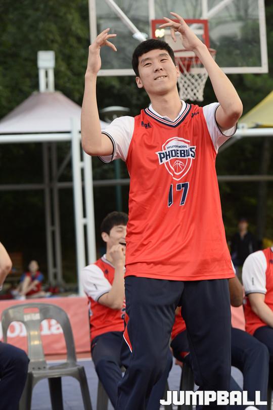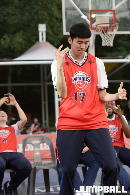 [점프볼=울산/홍기웅 기자] 24일 울산대공원 청소년광장에서 열린 2017 울산 현대모비스 3on3 바스켓볼 챌린지. 팬이 전준범에게 클럽 춤을 보여달라고 하자 힙합을 선곡해 클럽 춤을 추고 있다.