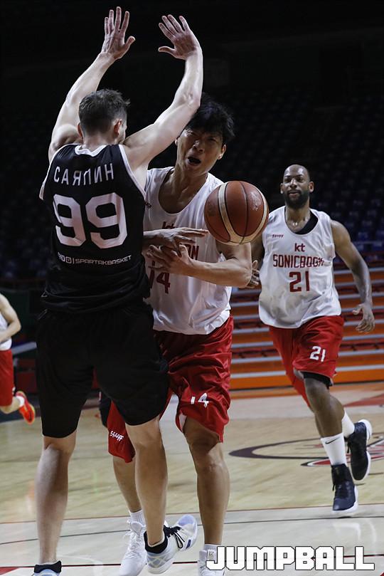 [점프볼=부산/점프볼사진부] 25일 사직실내체육관에서 진행된 부산KT와 러시아 블라디보스토크의 친선경기. KT 방상오가 골밑 슛을 하기전 블라디보스토크 수비에 부딪혀 공을 놓치고 있다.