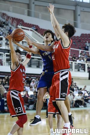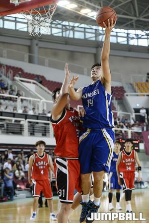 [점프볼=서울/홍기웅 기자] 26일 고려대학교 화정체육관에서 열린 '2017 남녀 대학 농구리그' 챔피언결정전 1차전 고려대와 연세대의 경기. 연세대 허훈이 고려대 김낙현 앞에서 레이업을 시도하고 있다.