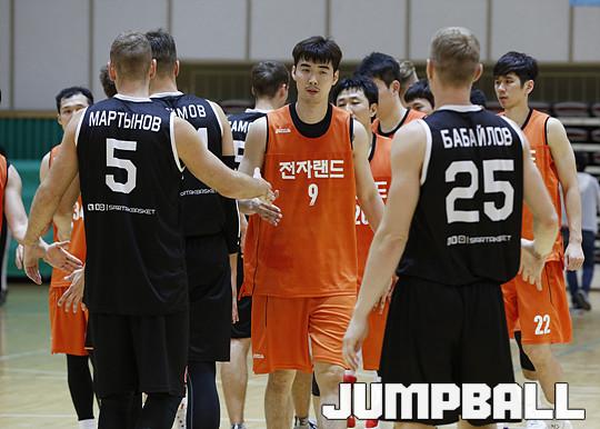 [점프볼=양산/점프볼 사진부] 28일 경상남도 양산에 위치한 양산실내체육관에서 열린 인천 전자랜드와 러시아 블라디보스톡의 친선경기, 양팀 선수들이 친선경기를 마무리하며 인사를 나누고 있다.