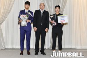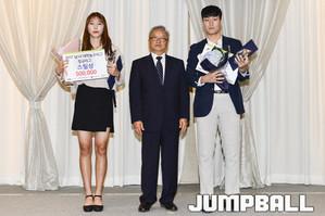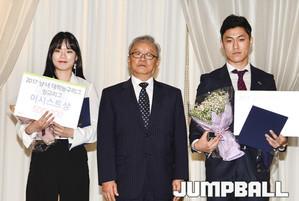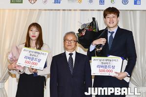 [점프볼=서울/홍기웅 기자] 30일 서울 더케이 호텔에서 열린 2017 남녀 대학 농구리그 시상식. 정규리그 MVP 고려대 김낙현, 광주대 장지은이 수상을 하고 있다.