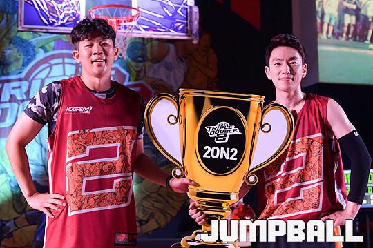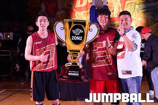 [점프볼=잠실/유용우 기자] 28일 잠실실내보조체육관에서 스포츠문화 전문기획사 ‘IADG’와 농구전문점 HOOPCITY가 공동주최로 ‘트리플더블페스티벌(Tripledouble2)’를 개최했다. 이번 행사는 다양한 장르의 예술이 ‘농구’라는 하나의 주제로 뭉치는 복합문화축제로, 농구 경기를 메인으로‘문화’라는 컨텐츠를 접목해 기존 농구대회와는 다른 차별점을 가지고 있다. . 트리플더블 페스티벌2 2ON2 경기에서 'LP'팀이 우승을 거둬 우승컵을 전달받아 들고 있다.