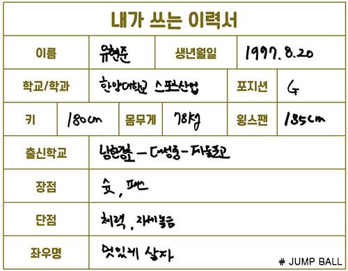[점프볼=강현지 기자] 2017년 신인 드래프트에 도전하는 '예비 프로'가 쓰는 취업 이력서. 열여섯 번째 주인공은 한양대 유현준(20, 181cm)이다. 고졸루키를 생각에만 그쳤던 그가 얼리 엔트리를 선언하게 된 이유는 뭘까. #성격, #입사(프로데뷔)후 포부를 전하며 그 이유도 함께 설명했다.