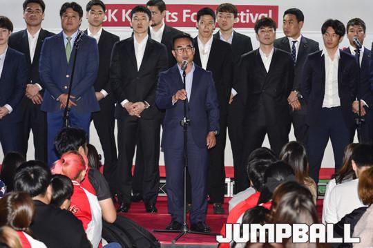 [점프볼=서울/홍기웅 기자] 7일 잠실한강크루즈에서 서울 SK나이츠가 출정식을 가졌다. 출정식에는 선상에서 선수들과 함께하는 식사시간 및 질문시간 등을 가졌으며 출정식 하이라이트로 선수들의 합창을 감상하고 다같이 불꽃놀이를 관람하는 것으로 출정식을 마무리 지었다. SK 단장이 출정식에 참석한 팬들을 향해 인사하고 있다.