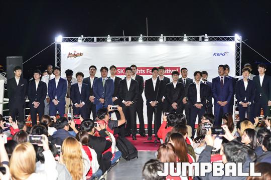 [점프볼=서울/홍기웅 기자] 7일 잠실한강크루즈에서 서울 SK나이츠가 출정식을 가졌다. 출정식에는 선상에서 선수들과 함께하는 식사시간 및 질문시간 등을 가졌으며 출정식 하이라이트로 선수들의 합창을 감상하고 다같이 불꽃놀이를 관람하는 것으로 출정식을 마무리 지었다. SK 선수와 코칭스탭이 팬들을 향해 뮤지컬 '지킬앤하이드'의 곡인 '지금 이순간'을 합창하고 있다.