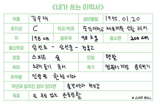 [점프볼=강현지 기자] 2017년 신인 드래프트에 도전하는 ‘예비 프로’가 쓰는 취업 이력서. 열여덟 번째의 주인공은 중앙대학교 김우재(22, 198cm)다. 장신인 데다 내외곽을 오가는 플레이로 중앙대 살림꾼 역할을 해낸 그가 이제 프로무대 도전 앞에 섰다. 그가 돌아본 농구 인생, 그리고 2017년 KBL 국내신인선수 드래프트에 참가하는 각오를 들어봤다.