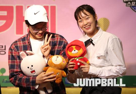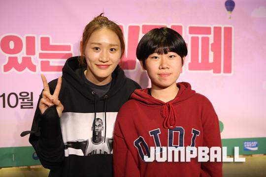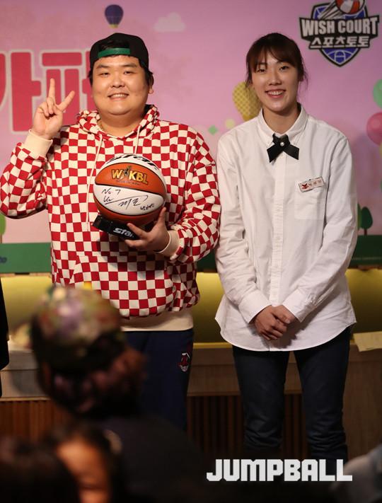 한국여자농구연맹(WKBL)은 스포츠토토와 함께 14일 송파구에 위치한 카페에서 팬들과 함께하는 ‘위시(WISH)가 있는 W카페’ 행사의 하이라이트 경매의 시간, 경매에 성공한 팬들과 선수들이 함께 포즈를 취하고 있다.