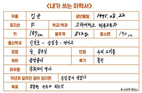 [점프볼=강현지 기자] 2017년 신인 드래프트에 도전하는 ‘예비 프로’가 쓰는 취업 이력서. 열아홉 번째의 주인공은 고려대학교 김윤(22, 187cm)이다. 필요할 때 3점슛 한 방을 터뜨려 줄 수 있는 능력을 갖춘 김윤은 오는 10월 30일에 열리는 2017년 KBL 국내신인선수 드래프트에 참가한다. 가만 보니 그 슛을 던지는 자세가 누군가와 많이 닮았다. #성장과정, #경력사항, #입사 후 포부를 통해 김윤의 이야기를 들어보자.