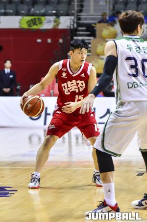 [점프볼=고양/홍기웅 기자] 18일 고양실내체육관에서 열린 정관장프로농구 KBL2017-2018 시즌 오리온과 DB의 경기. 오리온 김진유가 동료에게 앞으로 나와 받을 것을 지시하고 있다.