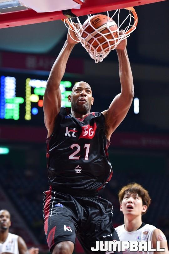 [점프볼=부산/윤희곤 기자] 21일 부산 사직체육관에서 열린 '2017-2018 정관장 프로농구' 부산 KT와 서울 SK의 경기, KT 윌리엄스가 투핸드 덩크슛을 성공시켰다.