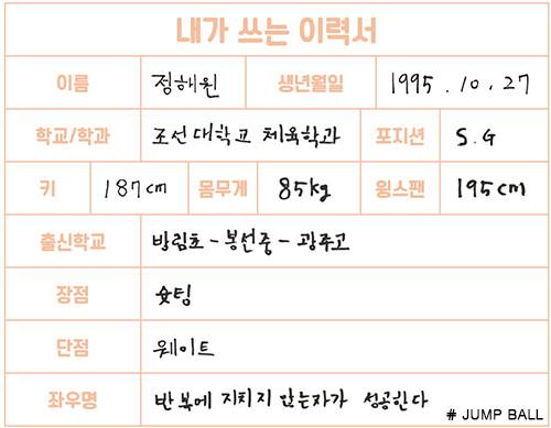 [점프볼=강현지 기자] 2017년 신인 드래프트에 도전하는 ‘예비 프로’가 쓰는 취업 이력서. 스물한 번째의 주인공은 조선대학교 주장 정해원(22, 187cm)이다. 3점슛 하나로 대학 무대에서 이름 알린 정해원이 프로 무대 진출에 도전한다. 이에 앞서 그가 농구를 하게 된 배경, 또 앞으로는 어떤 선수가 되고 싶을 지에 대한 이야기를 들어봤다.
