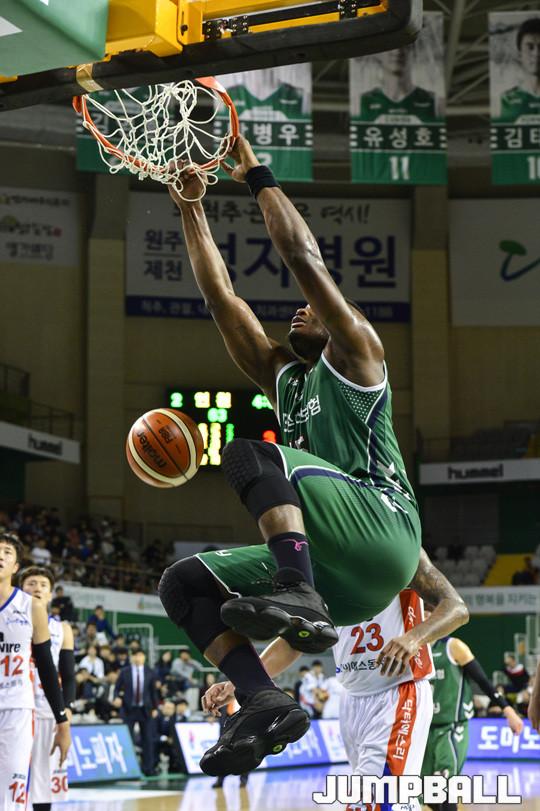 [점프볼=원주/홍기웅 기자] 22일 원주종합체육관에서 열린 2017-18 정관장 프로농구 원주 DB와 인천 전자랜드의 경기. DB 디온테 버튼이 투핸드 덩크를 꽂고 있다.