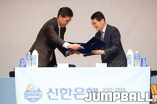 [JB포토] 타이틀스폰서 조인서 교환하는 신선우 총재와 위성호 신한은행장