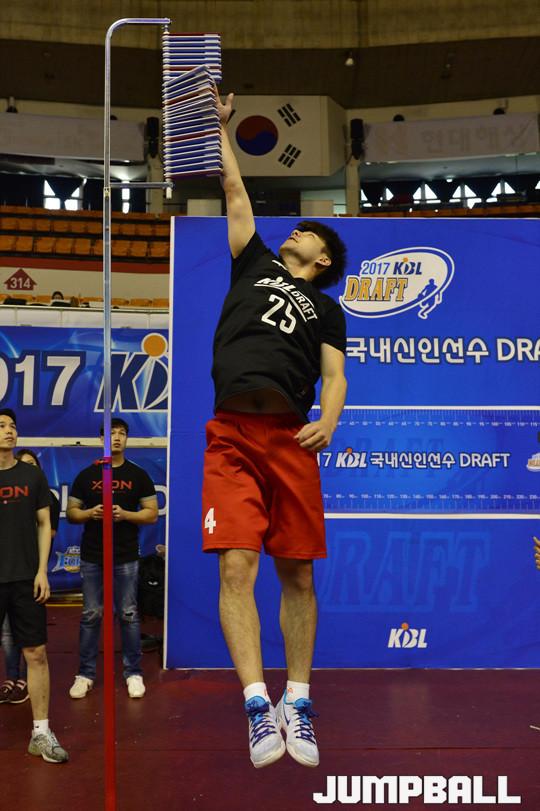 [점프볼=서울/홍기웅 기자] 23일 잠실학생체육관에서 2017 KBL 국내신인선수 신체측정을 가졌다. 예비 신인 선수들이 버티컬 점프 측정을 하고 있다.