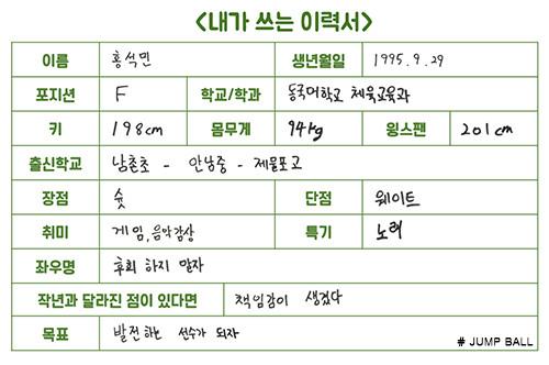 [점프볼=강현지 기자] 2017년 신인 드래프트에 도전하는 ‘예비 프로’가 쓰는 취업 이력서. 스물네 번째의 주인공은 동국대학교 주장 홍석민(22, 198cm)이다. 3점슛이 가능한 장신 포워드, 홍석민이 프로 무대 진출 도전 앞에 선다. 최종 면접을 4일 앞둔 가운데, 그의 #성장과정, #입사 후 포부를 들어봤다.