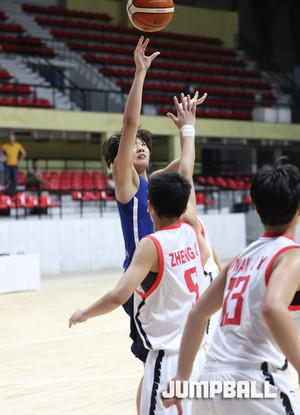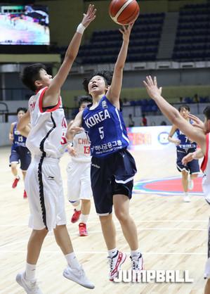 26일 인도 방갈로루에서 열린 2017 FIBA U16 아시아여자농구 대회 8강전 중국과의 경기, 한국 대표팀의 최미현이 상대가 공간을 빠져나가지 못하게 몸싸움을 펼치고 있다.