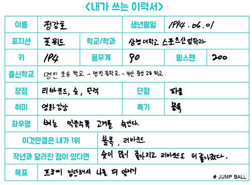 [점프볼=강현지 기자] 2017년 신인 드래프트에 도전하는 ‘예비 프로’가 쓰는 취업 이력서. 스물다섯 번째의 주인공은 상명대학교 주장 정강호(23, 194cm)이다. 뛰어난 운동능력과 활동량으로 리바운드, 블록슛에서 강점을 보인 정강호가 프로 무대 진출을 꿈꾸고 있다. 최종면접을 3일 앞둔 가운데, 그의 #성장과정, #입사 후 포부를 들어봤다.