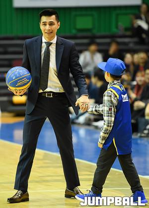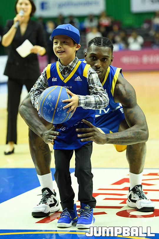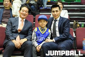 [점프볼=잠실/유용우 기자] 29일 잠실 실내체육관에서 열린 '2017-2018 정관장 프로농구' 서울 삼성과 부산 kt의 경기, 삼성 주희정 선수의 은퇴식이 하프타임에 예정된 가운데 아들인 주지우 군이 시구자로 나섰다. 삼성 라틀리프가 지우군을 안고 시구 성공을 돕고 있다.