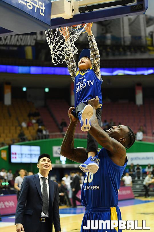 [점프볼=잠실/유용우 기자] 29일 잠실 실내체육관에서 열린 '2017-2018 정관장 프로농구' 서울 삼성과 부산 kt의 경기, 삼성 주희정 선수의 은퇴식이 하프타임에 예정된 가운데 아들인 주지우 군이 시구자로 나섰다. 삼성 라틀리프가 지우군을 안고 시구 성공을 돕고 있다.
