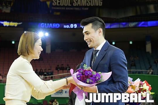 [점프볼=잠실/유용우 기자] 29일 잠실 실내체육관에서 열린 '2017-2018 정관장 프로농구' 서울 삼성과 부산 kt의 경기, 하프타임 농구인사들과 가족들이 참석한 가운데 주희정의 은퇴식이 진행됐다. 삼성 오동석 단장, 주장 김태술은 은퇴 기념 선물을 전달했다. KBL 이성훈 사무총장, 최명룡(전 나래 블루버드 감독), 이상민 감독 이현호는 주희정에게 기념 꽃다발을 건넸다. 주희정의 아내, 아이들도 코트에 나와 주희정의 은퇴식에 함께 했다.