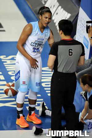 02일 용인 실내체육관에서 열린 '2017-2018 신한은행 여자프로농구' 용인 삼성생명 과 인천 신한은행과 의 경기, 삼성생명 토마스가 신한은행 김아름의 거친 플레이에 화를 내고있다.