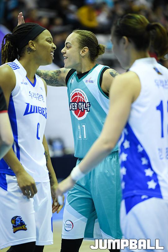 [점프볼=아산/유용우 기자] 13일 아산 이순신체육관에서 열린 '2017-2018 신한은행 여자프로농구' 아산 우리은행과 부천 KEB 하나은행의 경기, KEB 하나은행 과트미가 동료의 추가 자유투에 기뻐하고 있다.