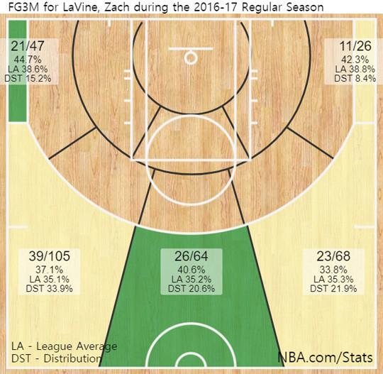 #잭 라빈 2016-2017시즌 정규리그 3점슛 성공률 분포도