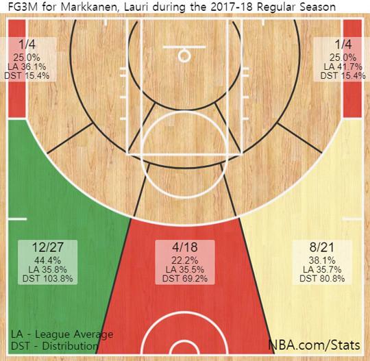 #2017-2018시즌 라우리 마카넨 3점슛 성공률 분포도(*15일 기준)