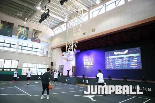 19일 서울 경복고 체육관에 마련된 나이키 배틀 포스 메인 코트, 대형 배틀 포스 로고가 눈에 띈다.