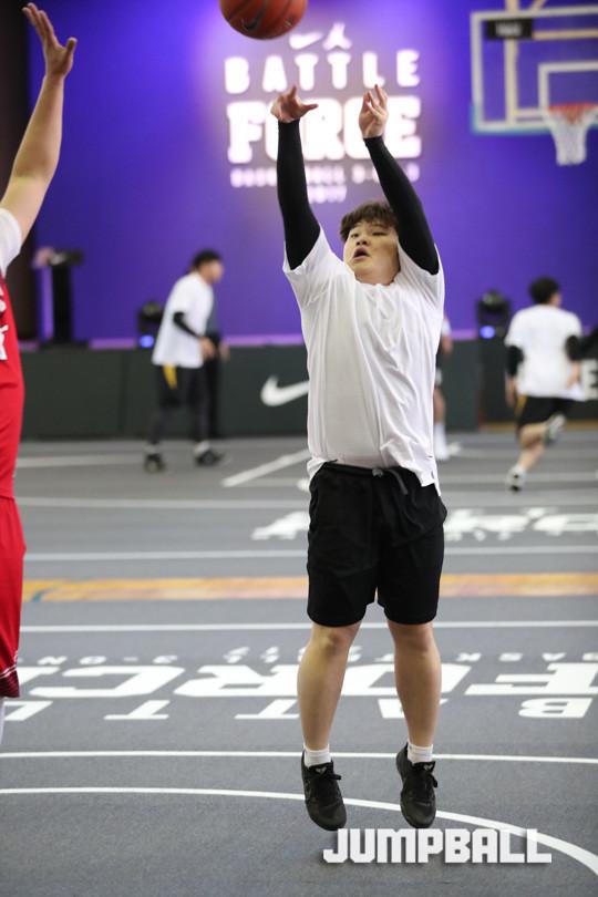 19일 서울 경복고 체육관에 마련된 나이키 배틀 포스 메인 코트, 본격적으로 경기가 시작된 후 한 참가자가 돌파에 이어 중거리슛을 던지고 있다.