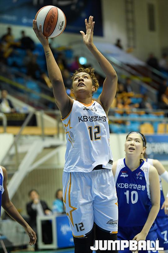 [점프볼=구리/유용우 기자] 20일 구리시체육관에서 열린 '2017-2018 신한은행 여자프로농구' 구리 KDB생명과 청주 KB의 경기, KB 단타스가 골밑 득점을 올리고 있다.
