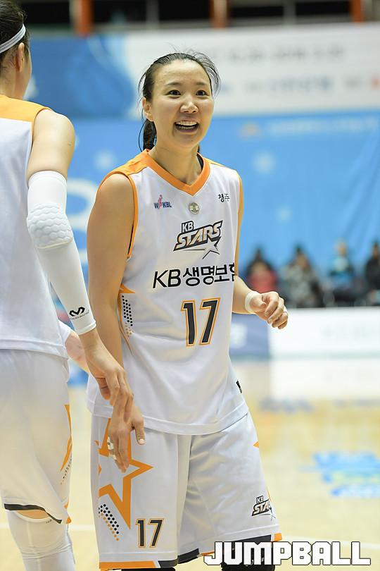 [점프볼=구리/유용우 기자] 20일 구리시체육관에서 열린 '2017-2018 신한은행 여자프로농구' 구리 KDB생명과 청주 KB의 경기, KB 김보미가 수비에 성공하자 환하게 웃고 있다.