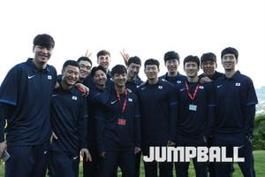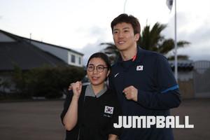 22일 뉴질랜드 웰링턴 테 라파라하 아레나에서 있었던 오전 훈련, 한국 시간으로 때 이른 시간이어서 그런지 다소 부은 얼굴의 김종규가 환한 표정을 지으며 훈련을 준비하고 있다.