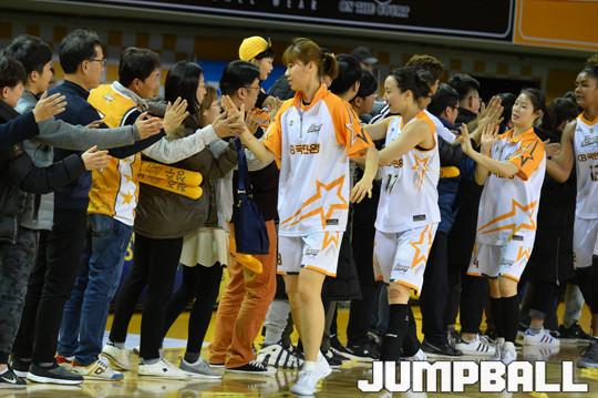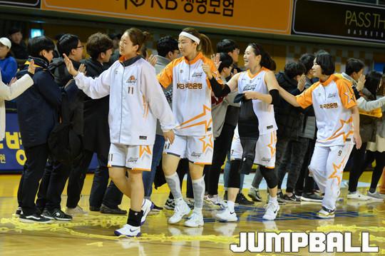 [점프볼=청주/홍기웅 기자] 24일 청주 실내체육관에서 열린 '2017-2018 신한은행 여자프로농구' 청주 KB와 아산 우리은행의 경기. KB 선수들이 팬들과 하이파이브로 승리를 즐기고 있다.