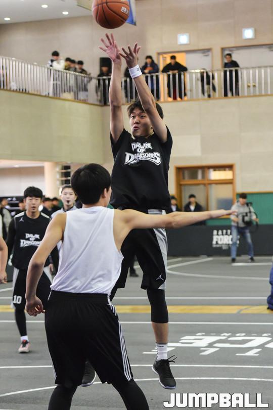 [점프볼=서울/홍기웅 기자] 25일 경복고등학교 체육관에서 열린 '2017 나이키 배틀 포스 바스켓볼 3-on-3' 고등부 경기. DOD 선수가 수비가 딴 곳을 본 사이 점프 슛을 던지고 있다.