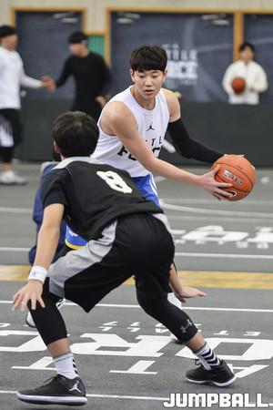 [점프볼=서울/홍기웅 기자] 25일 경복고등학교 체육관에서 열린 '2017 나이키 배틀 포스 바스켓볼 3-on-3' 고등부 경기. 농구하자 선수가 Project ball의 수비에 힘겨워하고 있다.